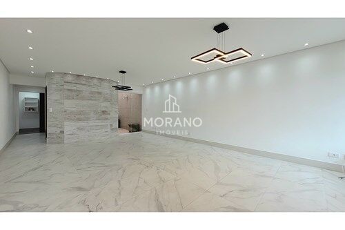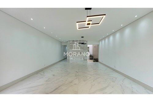 A sala é um dos pontos altos: ampla, extremamente iluminada e com piso porcelanato claro que imita mármore, criando uma sensação de sofisticação e amplitude. O projeto de iluminação, com luminárias modernas, geométricas e spots embutidos, valoriza cada detalhe do ambiente. O pé-direito alto, as paredes em tons neutros e o painel que imita madeira rústica completam o charme e a elegância do espaço.